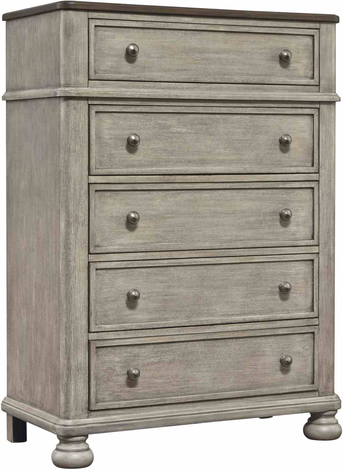 Satisfy your taste for casually cool refinement with this chest of drawers. A celebration of traditional forms and luxurious materials, this chest is an easy addition to your elegant farmhouse interior. The antiqued gray and walnut finish elevates the aesthetic, while the framed inset drawer fronts bring an added touch of dimension and flair.