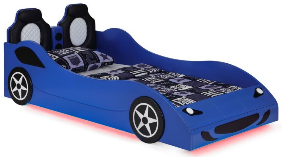 Blue twin size racecar bed featuring a sleek modern design with realistic detailing