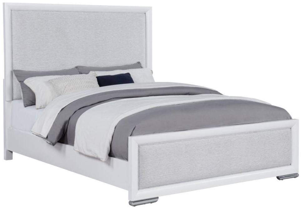 White finish outlines light grey fabric headboard and footboard for clean structure