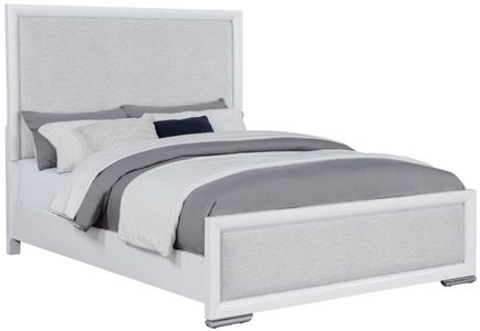 This panel bed pairs crisp framing with soft textures for a look that feels both refined and restful. The panel-style headboard and footboard are upholstered in light grey fabric with subtle herringbone texture, bordered by a clean white frame and finished with brushed nickel feet.Read More