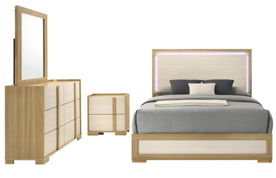 A natural-finish queen bedroom set featuring four pieces with a clean, classic design. Includes a panel bed, dresser, mirror, and nightstand, all crafted for durability and style. Perfect for creating a warm, inviting atmosphere in your bedroom.Read More