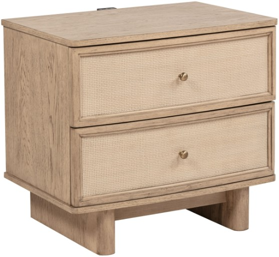 This nightstand combines practicality with an elegant design, offering two drawers for convenient bedside storage. Finished in beige oak, it features smooth metal extension glides for easy access and antique brass hardware for a touch of vintage charm.Read More