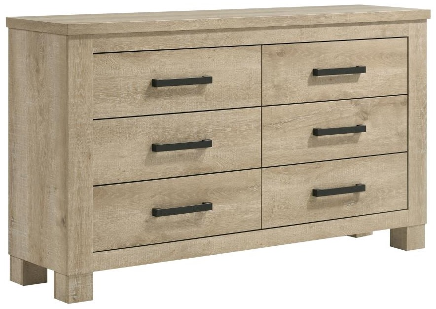 This six-drawer dresser offers a stylish blend of rustic charm and modern practicality. Featuring a weathered oak finish, it is crafted from engineered wood with a scratch-resistant veneer for long-lasting durability. Dark bronze handles provide bold contrast, while the smooth-gliding drawers offer ample space for clothing and essentials.Read More