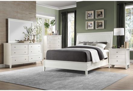 With transitional styling that is at home in a number of decorative environments, the Cotterill Collection will be a versatile addition to your bedroom. White finish over birch veneer, dramatically enhance the wood grain and is perfectly accented by the nickel hardware that punctuates each drawer front. Depending on your finish choice the headboard will feature either a white, gray or black bi-cast vinyl insert with x-stitching and button-tufting.Read More