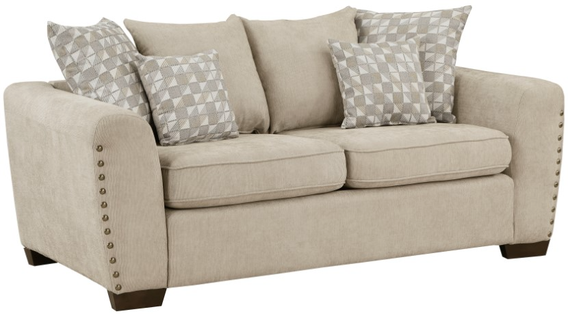 Designed for the transitional style that defines your home’s décor, the Silverthorne Collection pairs classic accents with a refined profile. The contoured arms of the love seat feature oversized nailhead trim. Sesame-hued chenille fabric upholstery covers the seating, and loose back pillows, its neutral hue complemented by the accompanying geometric toss pillows.Read More