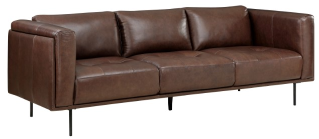 The brown top-grain leather covers the sofa where the hand touches, with split-leather match covering the remaining surface.