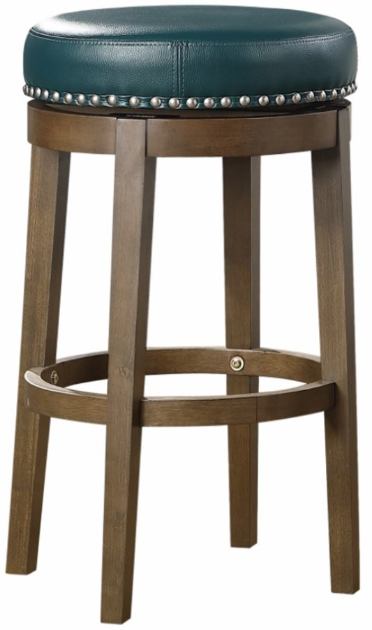 Transitional styling paired with versatility of selection makes the Westby collection a perfect addition to your home’s casual dining spaces. The round, swivel seat, pub height stool is presented at 29-inches. The brown finished wood legs complement the green faux leather seat which features nailhead trim that further defines the stool’s round profile.Read More