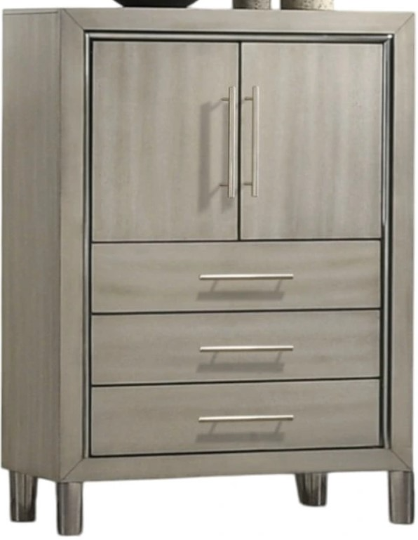 The furniture features a specialty metallic finish over wood that mimics the modern, polished look of stainless steel while offering exceptional durability and scratch resistance. It enhances the light gray finish, adding a sleek, sophisticated touch ideal for a contemporary ambiance.