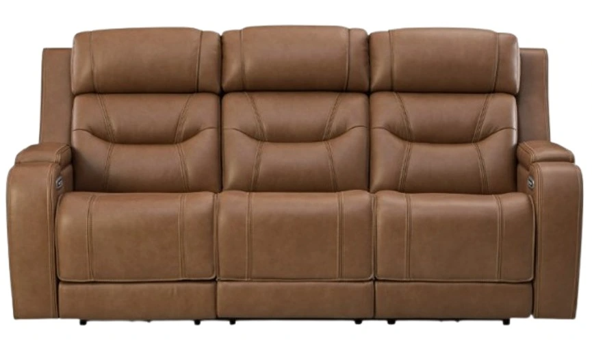 The Signature Design by Ashley® Dreamer Caramel Power Reclining Sofa with Audio offers a blend of comfort and convenience. Featuring power reclining functions and soft caramel upholstery, it also includes built-in speakers for an immersive audio experience, making it perfect for both relaxation and entertainment in your living space.Read More