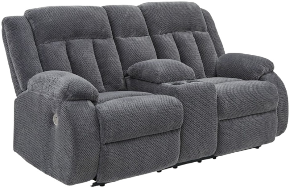 There's no need to sacrifice looks for comfort this power reclining loveseat with console serves up both, plus a richly relaxed sense of style. Its steel-hued velvet upholstery is ultra soft, with a plush waffle weave for an added layer of interest. The overstuffed pillow top armrests are custom made for lazy afternoon catnaps.Read More