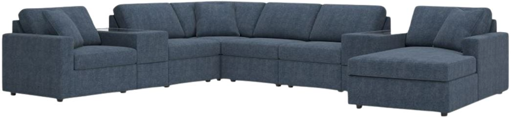 Includes 8 Modular Pieces: Left-arm facing corner chair, 3 armless chairs, 2 consoles with storage, wedge and right-arm facing corner chaise